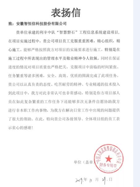 近日,安徽智(zhi)恒(heng)信科技(ji)股份有限公司接(jie)連收(shou)到2封表揚(yang)信,分別對智(zhi)恒(heng)信承接(jie)的武(wu)警(jing)利辛(xin)中隊“智(zhi)慧磐石(shi)”工(gong)程信息系統建設(she)項目和聯寶公司駐場服務進行表彰。