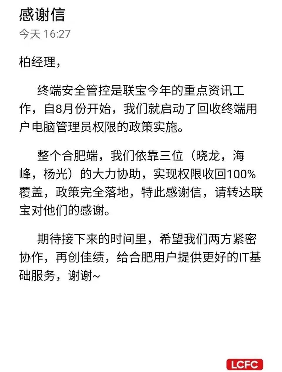 今年8月份,聯(lian)寶公司啟動回收(shou)(shou)終端用戶(hu)電(dian)腦管理員權(quan)(quan)限(xian)的(de)(de)(de)政策實施。該(gai)項目涉及(ji)合(he)肥聯(lian)寶工廠、聯(lian)想科技(ji)港的(de)(de)(de)研發(fa)部、深圳和(he)廣州(zhou)聯(lian)寶以及(ji)臺北聯(lian)寶的(de)(de)(de)所有辦(ban)公筆記本的(de)(de)(de)管理員權(quan)(quan)限(xian)的(de)(de)(de)回收(shou)(shou)。智恒(heng)信(xin)委(wei)派(pai)王(wang)曉龍、王(wang)海峰、楊光三位(wei)技(ji)術工程師駐場協助,負責合(he)肥地區大概2千臺的(de)(de)(de)辦(ban)公機的(de)(de)(de)管理員權(quan)(quan)限(xian)的(de)(de)(de)回收(shou)(shou)。